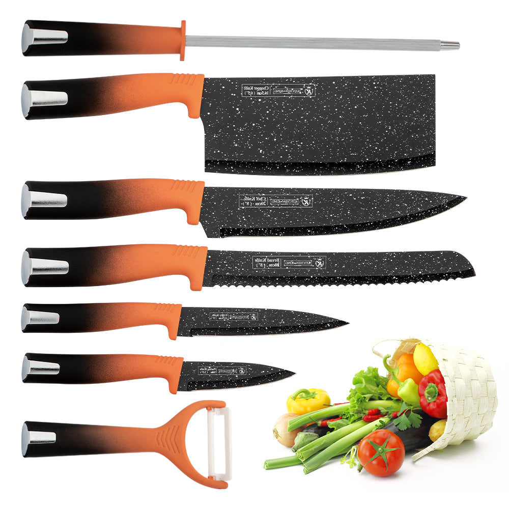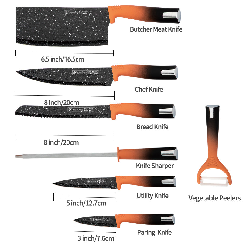 - 【Utility-driven Kitchen Knife Set】The 9-piece professional chef knife block set meets all the tools you need: 8” Chef Knife, 8” Bread Knife, 6.5” Kitchen Knife, 5” Utility Knife, 3.5” Paring Knife, Peeler, Multi-purpose Shears, Knife Sharpener, Acrylic Block. Kitchen Knife Sets keep knives organized, neat, and space-saving.